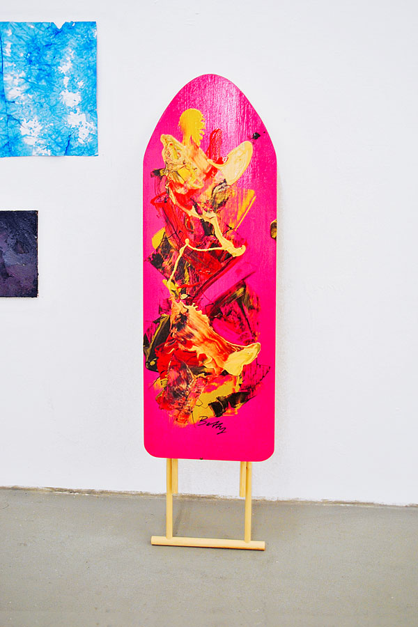 Weihnachten beschenkt man sich, auch unter Künstlern und sogar in Ausstellungen und da namhafte Künstler immer öfter Designobjekte produzieren, wie Handtaschen, Schuhe, Sofas und Skateboards ect. und ich allerdings nicht Skateboardfahren kann, man mich somit als „Betty“ schimpfen dürfte, die nur mit den Skaterboys „abhängt“, lag ein Bügelbrett als Boardersatz nahe.