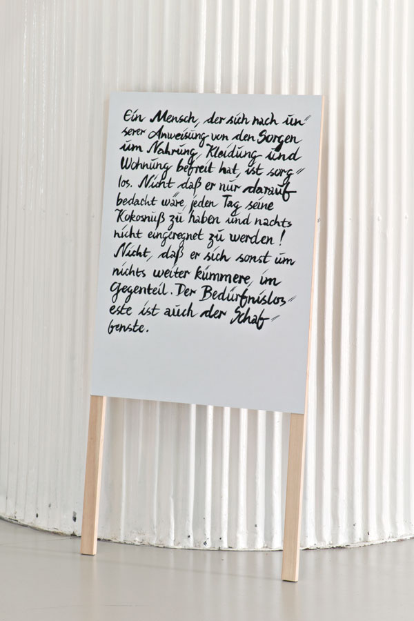 Ein Mensch, der sich nach unserer Anweisung von den Sorgen um Nahrung, Kleidung und Wohnung befreit hat, ist sorglos. Nicht, daß er darauf bedacht wäre, jeden Tag seine Kokosnuß zu haben und nachts nicht eingeregnet zu werden! Nicht, daß er sich sonst um nichts weiter kümmere, im Gegenteil. Der Bedürfnisloseste ist auch der Schaffenste.”